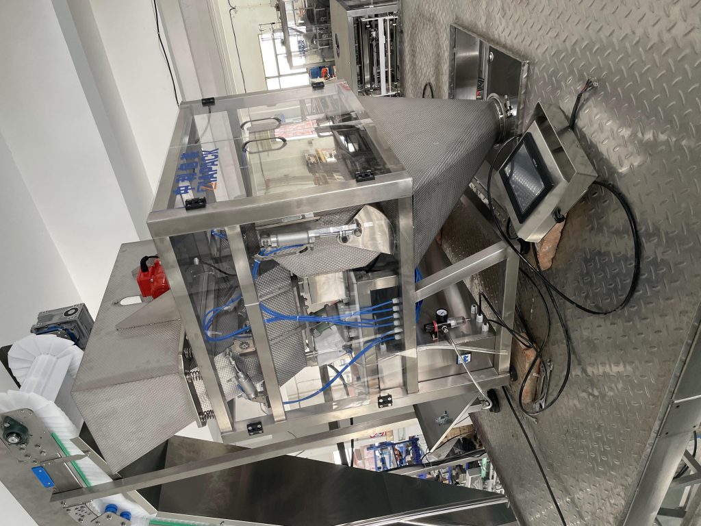 Оваа единица машина е специјален дизајн за пакување коцка мраз и ледена цевка во мека пластична кеса. Со функција на хранење на коцки мраз, мерење, полнење, автоматско запечатување за формирање кеси и излез на целосна кеса. Главната машина има функција за броење кеси и кодирање датуми .
