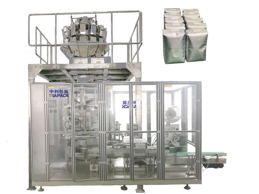 Целата линија вклучува една сет vffs торбичка за полнење машина за запечатување, една машина за пакување кеси со налепници, една машина за проверка на тежината и тампон транспортер и една сет машина за пакување филм со смалување. и искривување .На оваа единица машина има дополнителна опционална функција за вакуум за кеси што може да се додаде.