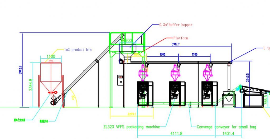 1, Самл машина за пакување за полнење за полнење торба. Овој дел, вклучувајќи го бункер за суровина, машина за хранење со завртки за наклонување. Среден тампон бункер, и хоризонтална завртка за хранење за испраќање на целата суровина до 6 комплети машина за мерење на шнекер