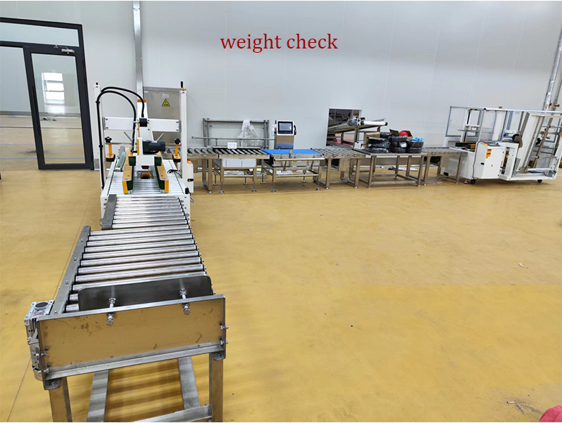 По полнењето на кесите со замрзната храна, секоја кеса повторно се проверува со детектор за тежина за да се осигура дека тежината се совпаѓа со целната тежина, а потоа поминува низ детектор за метал за да се осигура дека во секоја кеса не е измешан метал. Кесите потоа се транспортираат до линијата за полнење на картон.