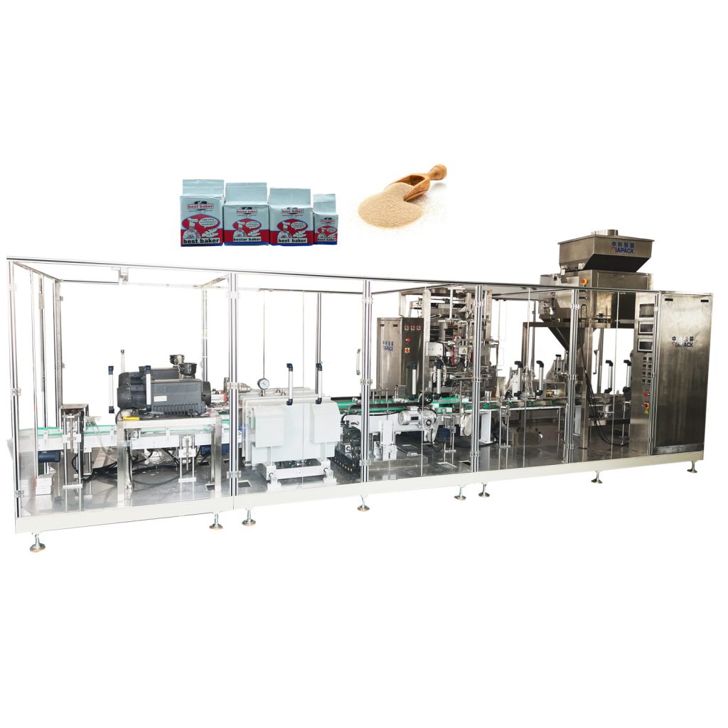 Оваа машина вклучува еден комплет вакуумски лифт ZK3 за хранење на сувиот квасец, еден комплет ZL520 машина за пакување и запечатување вертикални кеси. еден комплет ZLC4-2000 машина за мерење со четири кофи, Еден комплет ZL-100V2 машина за пакување со двојна вакуумска комора. Оваа машина е широко користена за пакување хемикалија во аптека за храна и друг производ во прав или мали гранули. Како кафе во прав, квасец во прав пченично брашно и така натаму. Степенот на вакуум е многу висок и брзината на пакување е многу висока, може да достигне 30 кеси/мин. Готовиот производ има долг рок на траење и убава форма.